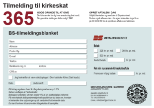 Kirkeskat er et løbende bidrag fra Kirkens medlemmer. Hvis du endnu ikke er registreret som medlem af Den katolske Kirke i Danmark, skal du først kontakte dit lokale sognekontor. Biskoppen anbefaler, at alle bidrager med mindst 1% af deres skattepligtige indkomst.