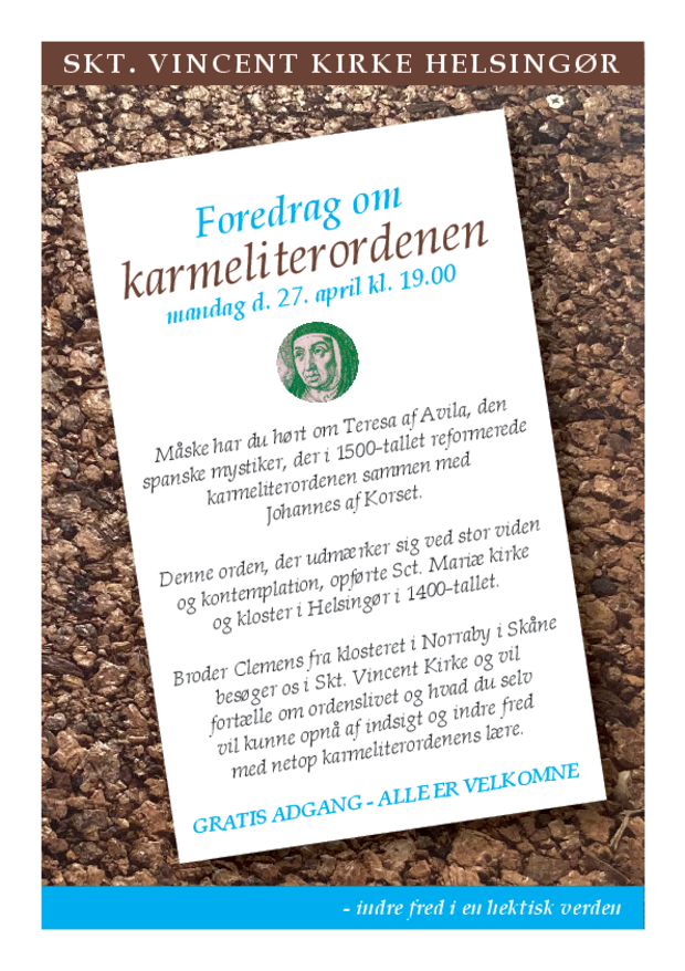 Mandag d. 27. april kl. 19.00 vil br. Clemens fra Karmeliterklosteret i Norraby i Skåne fortælle om karmeliterordenen. Her er mulighed for at få en levende indføring i ordenens tro og praksis, noget som mange har stiftet bekendtskab med f.eks. gennem Teresa af Avilas bog, "Sjælens Slot".